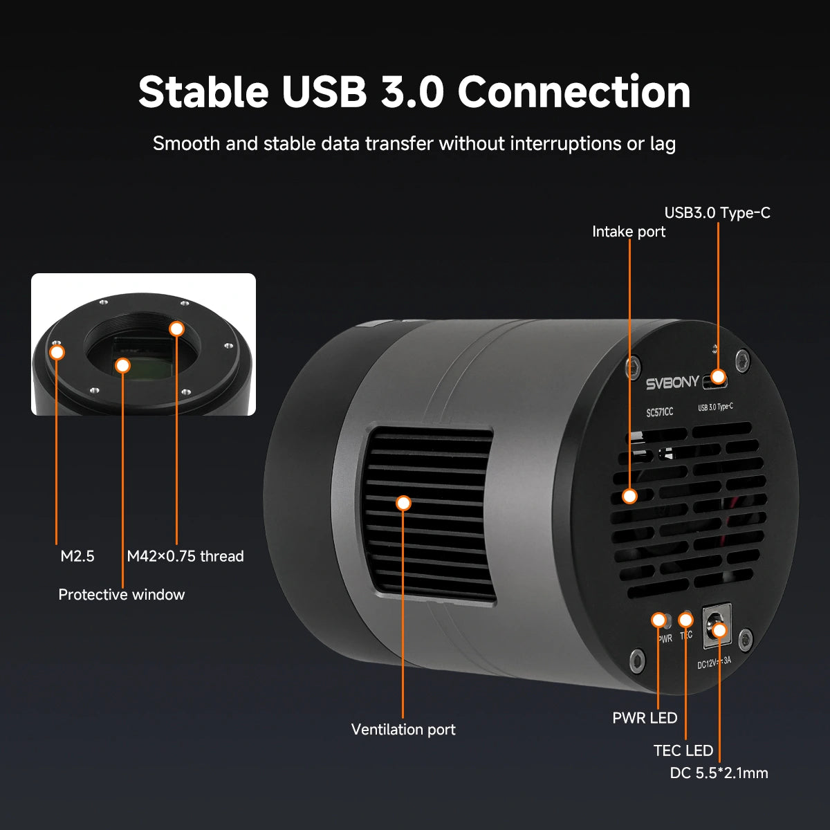 Découvrez la caméra refroidie couleur SVBONY SC571CC conçue pour l’imagerie du ciel profond avec capteur APS-C haute résolution et système de refroidissement puissant pour des clichés nets et à faible bruit.